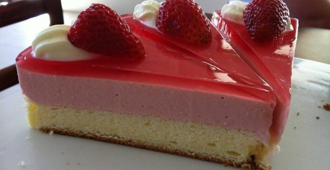 Quand la mixture de fraise est refroidie et commence un peu à prendre, y ajouter la crème fouettée, puis Verser le tout sur la génoise dans le cercle à pâtisserie et mettre au réfrigérateur jusqu’au lendemain