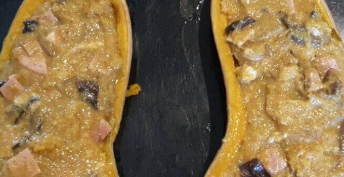 Répartir cette farce dans les demi-courges, saupoudrer d’emmental râpé et enfourner une dizaine de minutes.