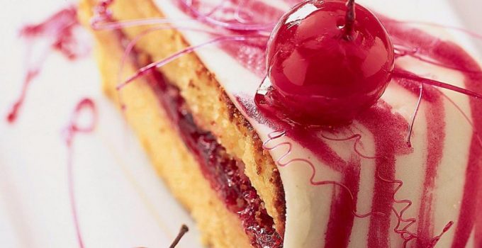 Couper le gâteau en deux dans l’épaisseur, le garnir de confiture de framboises. Étaler la pâte d’amandes en disque en saupoudrant le plan de travail et le rouleau de sucre glace. Habiller le gâteau avec cette pâte d’amandes, la strier avec le colorant rouge à l’aide d’un pinceau.
