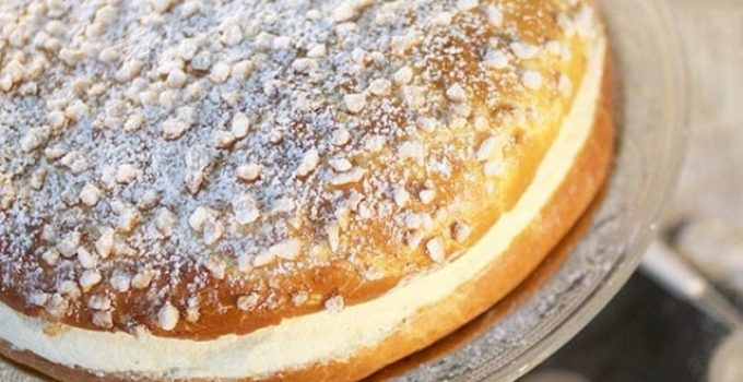 Placez votre crème tropézienne au centre de la partie inférieur de la brioche et lissez (vous pouvez la coucher à la poche à douille). Posez le couvercle dessus et saupoudrez de sucre glace.
