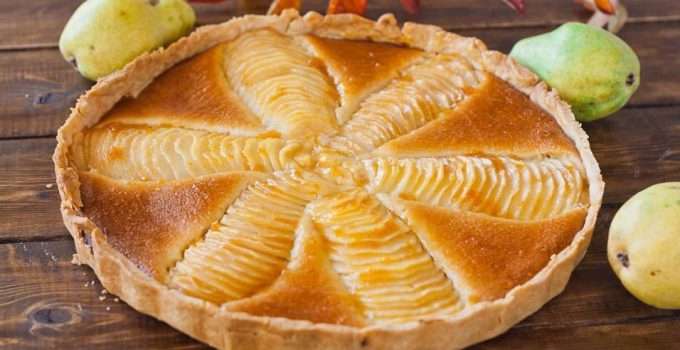 on peut répartir quelques amandes effilées sur les parties de crème restant visibles (entre les poires et au centre).